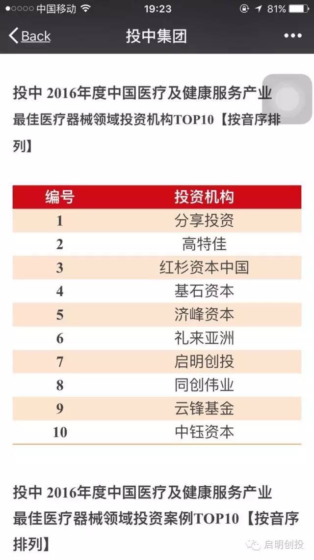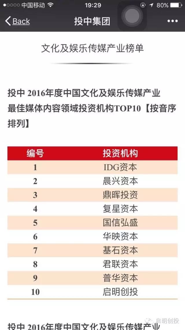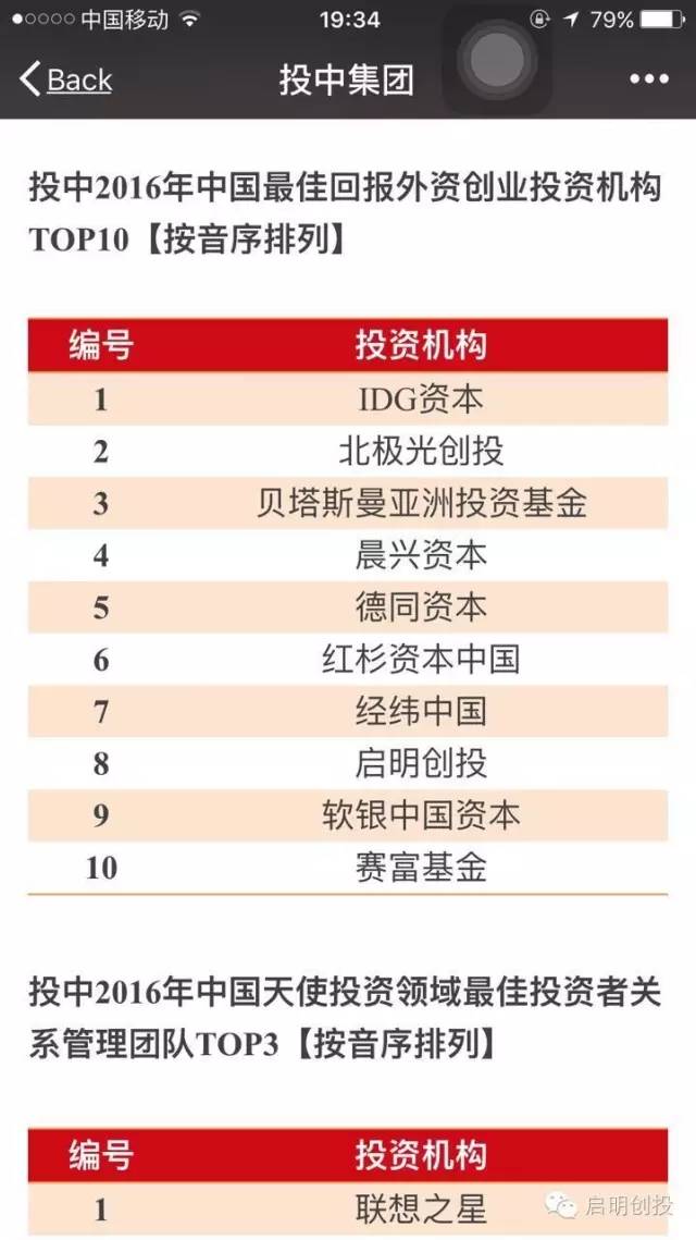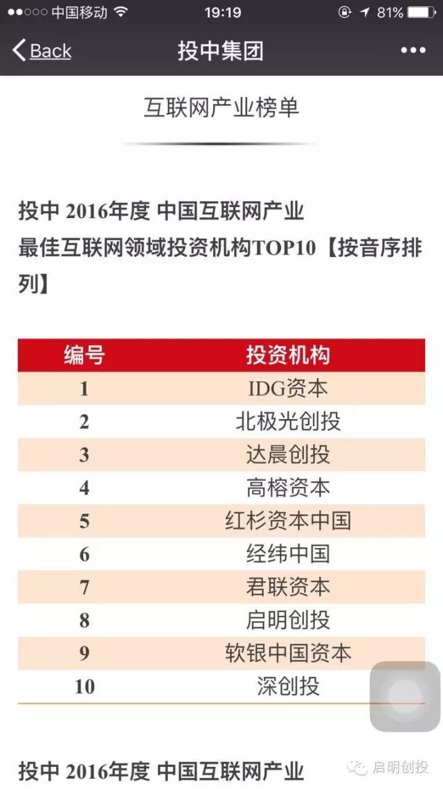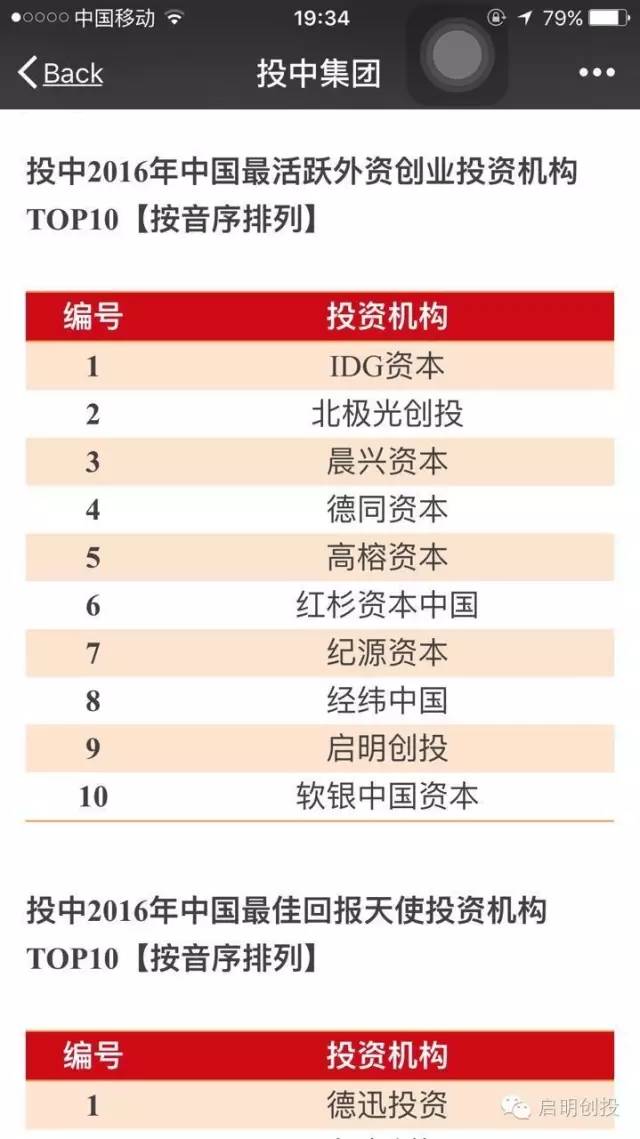 昨晚,在投中2016中國投資(深圳)年會上,“投中2016年度中國VC/PE產(chǎn)業(yè)榜”隆重發(fā)布。啟明創(chuàng)投分別斬獲“互聯(lián)網(wǎng)產(chǎn)業(yè)”、“醫(yī)療及健康服務(wù)產(chǎn)業(yè)”、“文化及娛樂傳媒產(chǎn)業(yè)”、“先進制造與高科技產(chǎn)業(yè)”、“新能源與清潔技術(shù)產(chǎn)業(yè)”幾乎涵蓋所有行業(yè)領(lǐng)域 “投資機構(gòu)TOP10”的稱號。同時還獲評“投中2016年中國最活躍外資創(chuàng)業(yè)投資機構(gòu)TOP10”、“投中2016年中國最佳回報外資創(chuàng)業(yè)投資機構(gòu)TOP10”、“投中2016年中國創(chuàng)業(yè)投資領(lǐng)域最佳外資投資者關(guān)系管理團隊TOP3”。而且在各產(chǎn)業(yè)領(lǐng)域最佳投資案例TOP10中,啟明投資的多家優(yōu)秀企業(yè)都榜上有名。