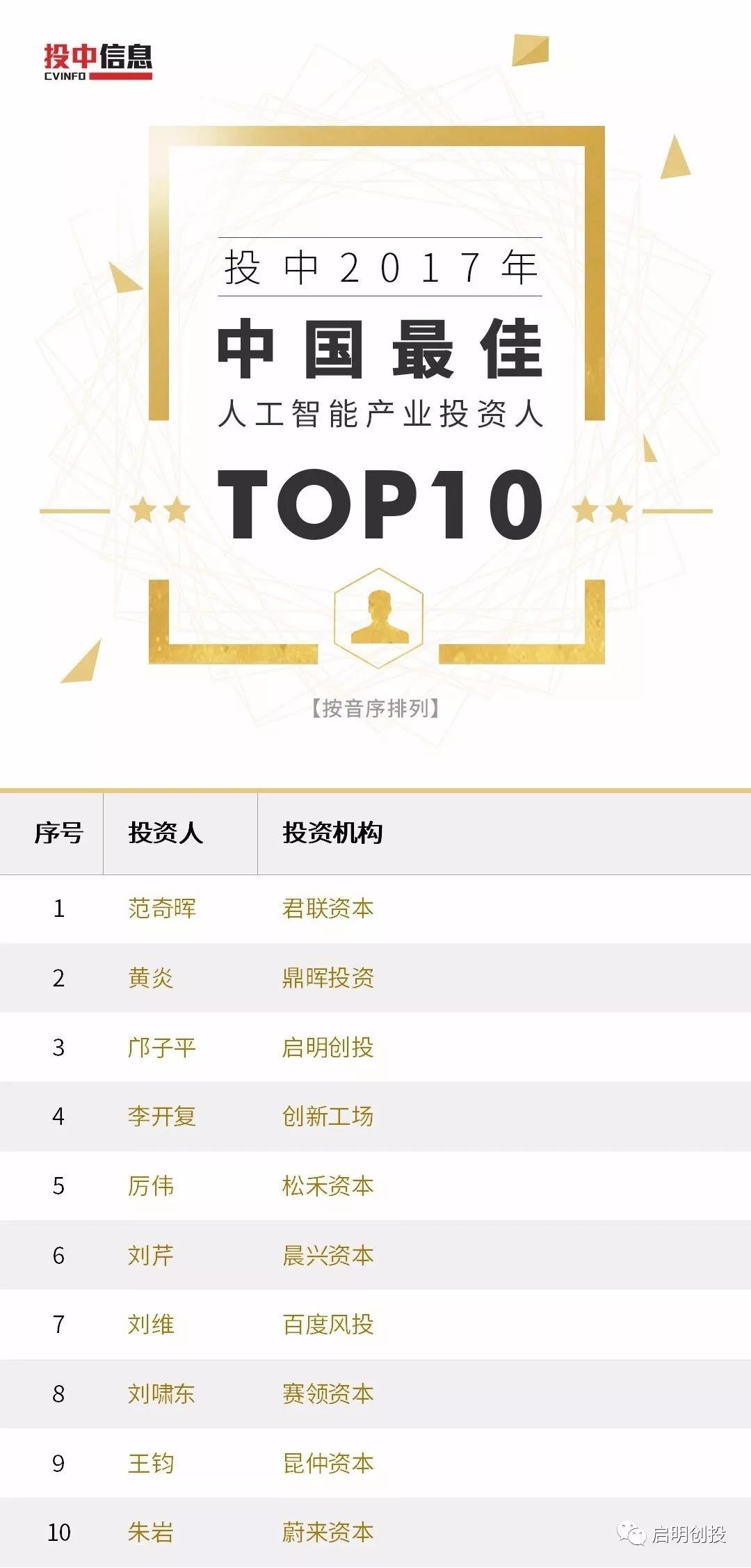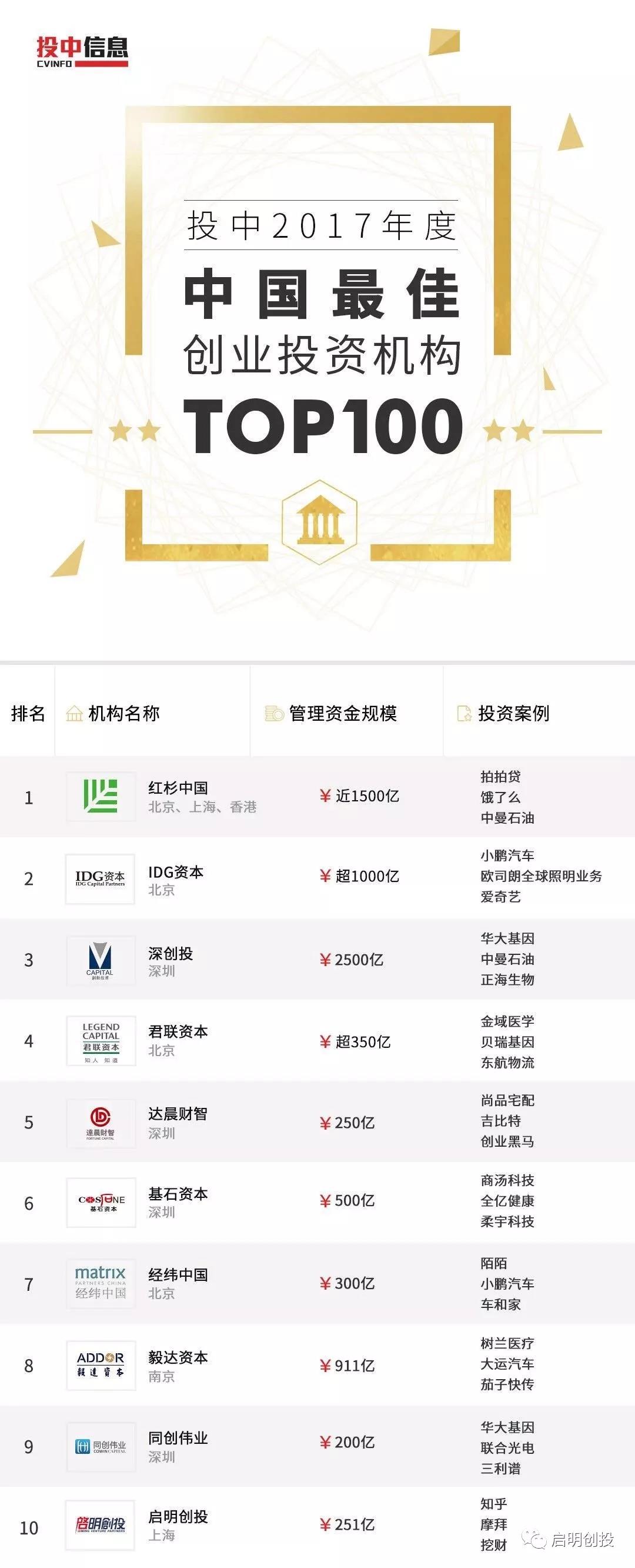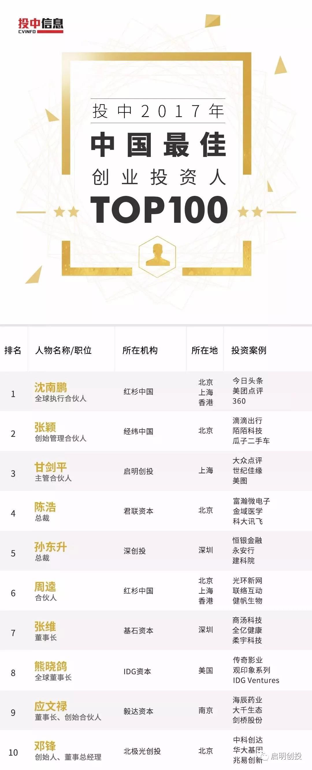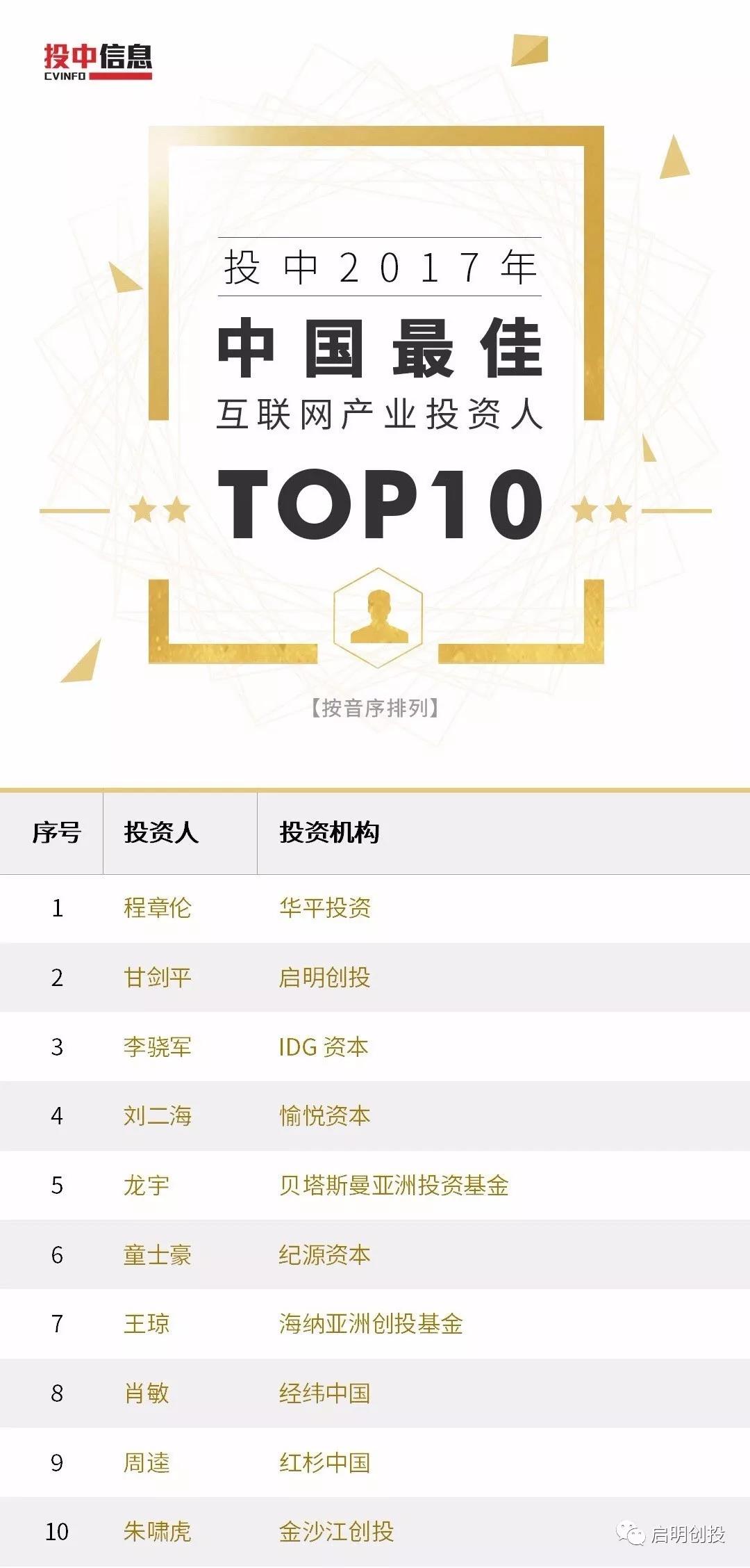 在投資人榜單方面,啟明創(chuàng)投有5位合伙人同時登上2017年度中國最佳創(chuàng)業(yè)投資人Top100榜單,包括:啟明創(chuàng)投主管合伙人甘劍平、梁穎宇、胡旭波、鄺子平,及合伙人張勇。其中主管合伙人甘劍平位列榜單第3位。