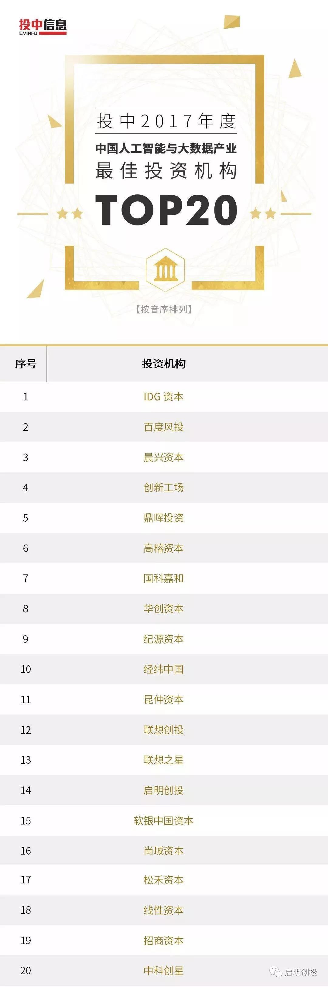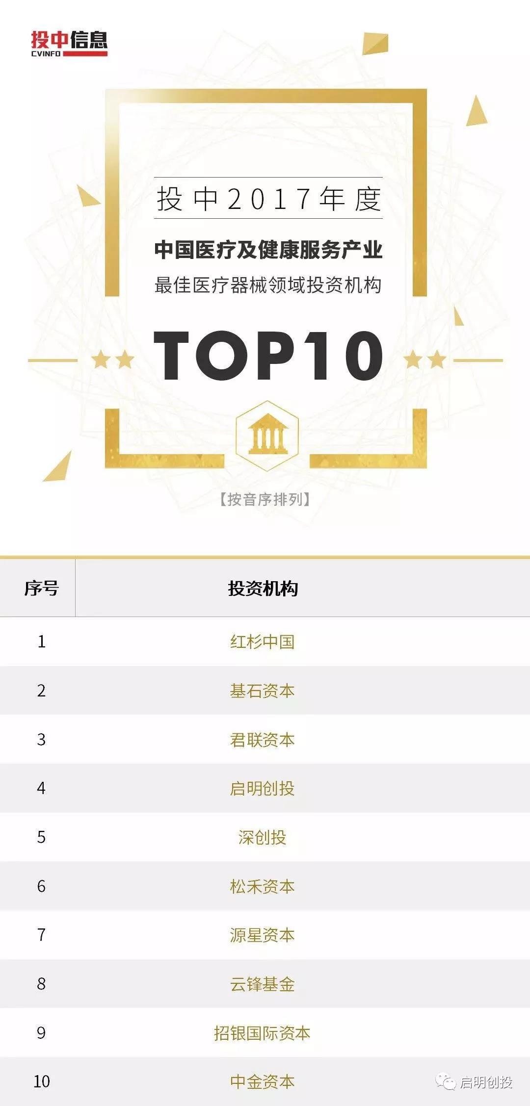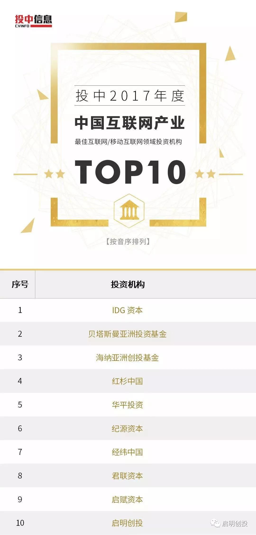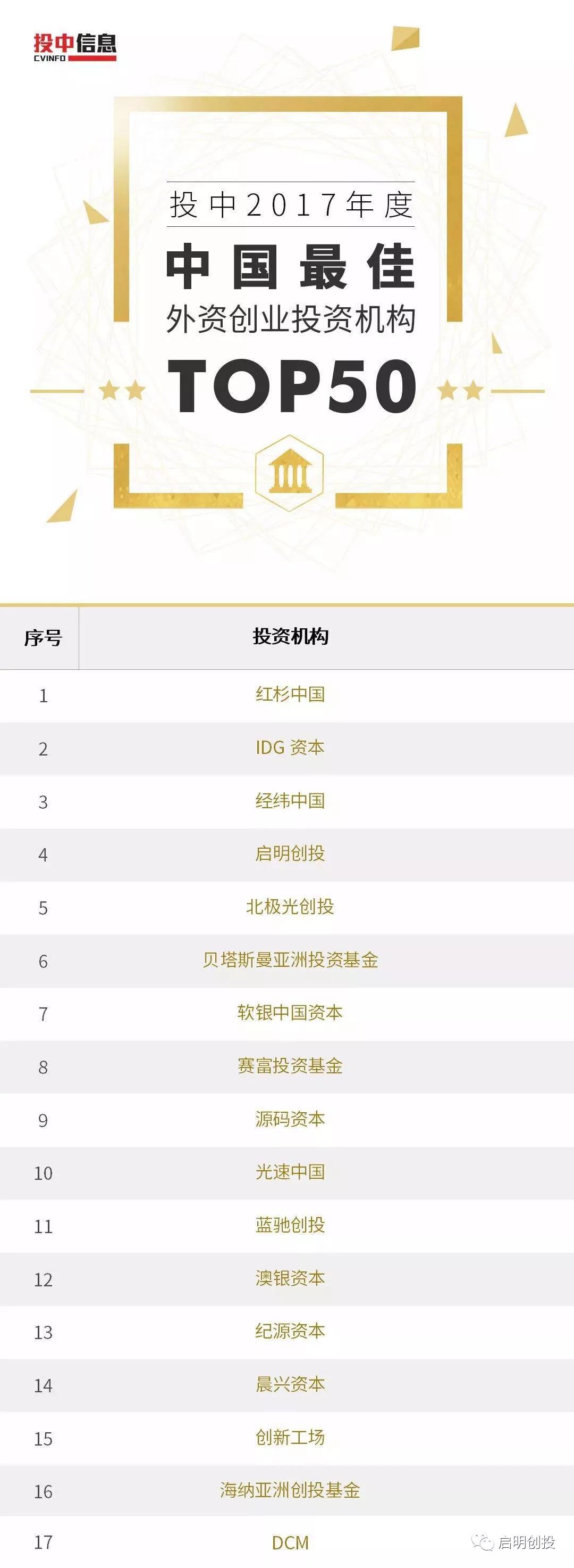4月24日,投中信息正式發(fā)布“投中 2017年度榜”榜單。在機構榜單中,啟明在各個行業(yè)領域全面開花,囊獲8項機構類別獎項,包括年度機構最大獎——中國最佳創(chuàng)業(yè)投資機構Top100 第10位、中國最佳外資創(chuàng)業(yè)投資機構Top50 第4位、最佳互聯(lián)網/移動互聯(lián)網領域投資機構Top10、中國醫(yī)療及健康服務產業(yè)最佳生物醫(yī)藥領域投資機構Top10、中國新能源與清潔技術產業(yè)最佳投資機構Top10、中國人工智能與大數據產業(yè)最佳投資機構Top20、中國企業(yè)服務產業(yè)最佳投資機構Top10。