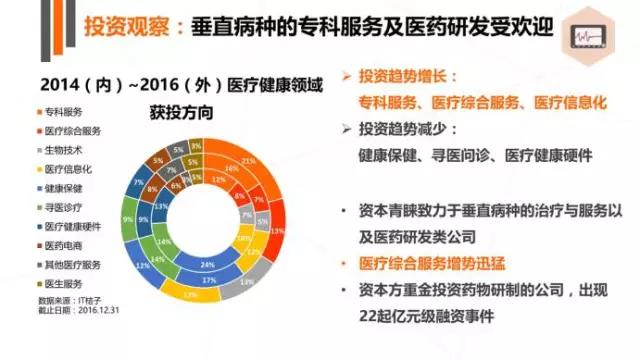 獲投比較熱門的領(lǐng)域有「專科服務(wù)」方向,如腫瘤、牙醫(yī)、母嬰類;有「醫(yī)療綜合服務(wù)」方向,如健康管理平臺;有「生物技術(shù)」方向,如藥物研發(fā)、生物制藥;有「醫(yī)療信息化」方向,如數(shù)據(jù)管理、SaaS 服務(wù);有「健康保健」方向,如康復(fù)醫(yī)療、老年保健等。
