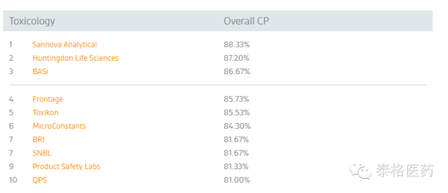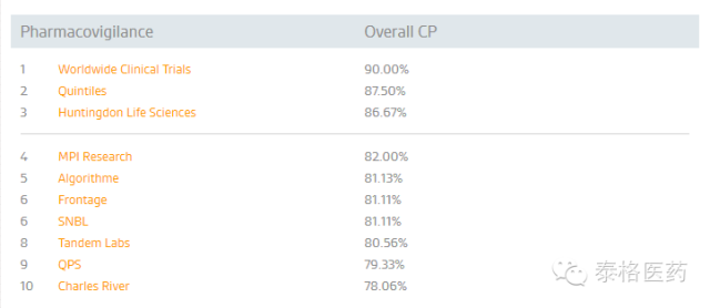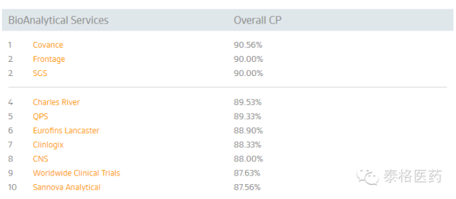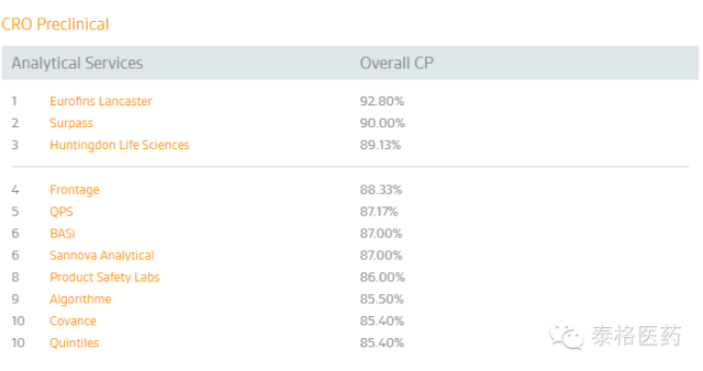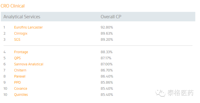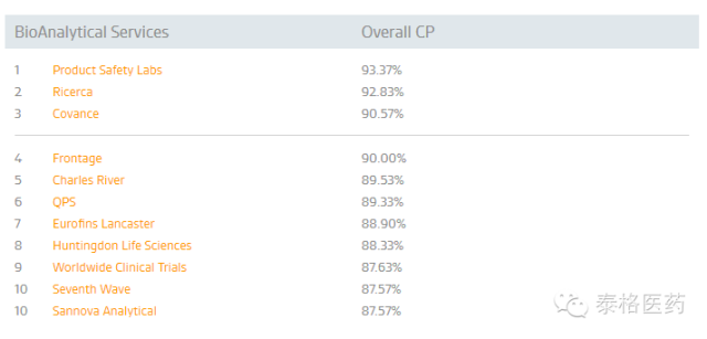 泰格醫(yī)藥子公司方達(dá)醫(yī)藥(Frontage)在由美國專業(yè)營(yíng)銷信息服務(wù)公司Nice Insight公布的2015年度TOP10 CRO公司中,名列第四位。該排名是外包服務(wù)采購方,按CRO公司的服務(wù)種類,從市場(chǎng)營(yíng)銷數(shù)據(jù)、口碑影響力及公司資歷方面給予評(píng)分,以六種對(duì)服務(wù)外包最具影響的因素——品質(zhì)、可靠性、生產(chǎn)力、負(fù)擔(dān)能力、創(chuàng)新及監(jiān)管背景作為衡量依據(jù),最終列出了得分最高的前10名。具體數(shù)據(jù)如下: