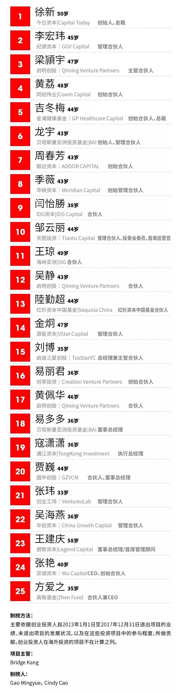 值得一提的是,除了梁穎宇之外,啟明創(chuàng)投的另外兩位女性投資人吳靜和黃佩華女士也成功上榜,分列第12位和第17位。