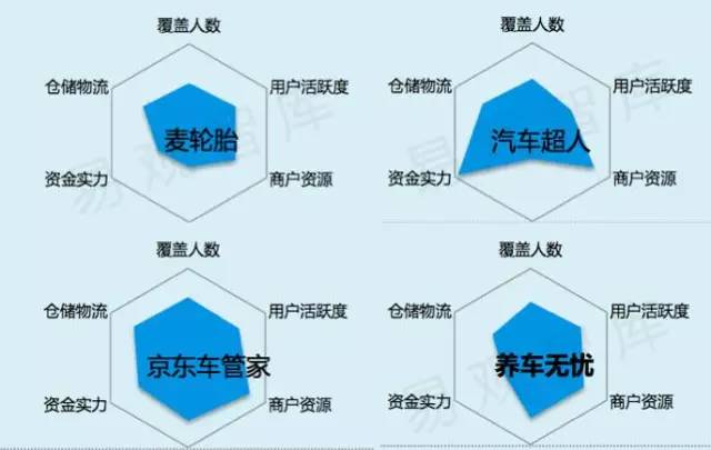 根據(jù)易觀智庫的分析報告,評估目前的自營型電商平臺綜合實力,應該從覆蓋人數(shù)、用戶活躍度、商戶資源、資金實力、倉儲物流的六個維度考察。截至目前,途虎養(yǎng)車網(wǎng)是當時無愧的最強者,在六個維度中實力、布局實力均衡,沒有明顯短板,而且做到了在長項數(shù)據(jù)上與對手拉開了很大的差距。