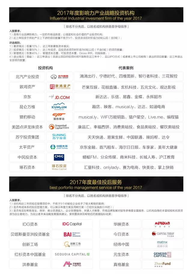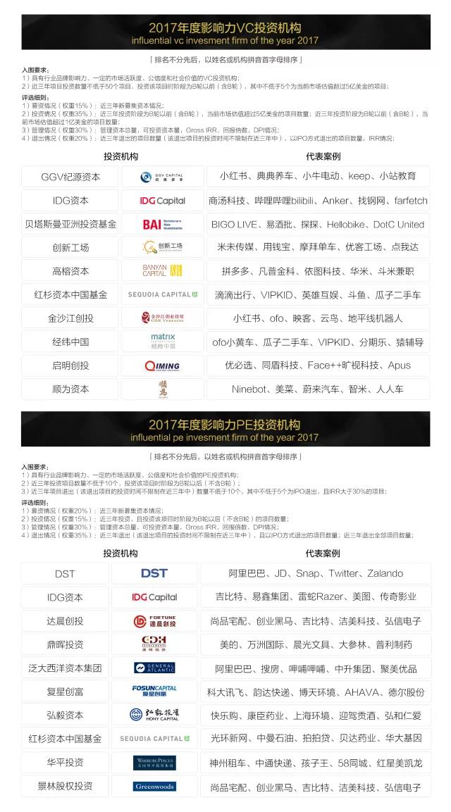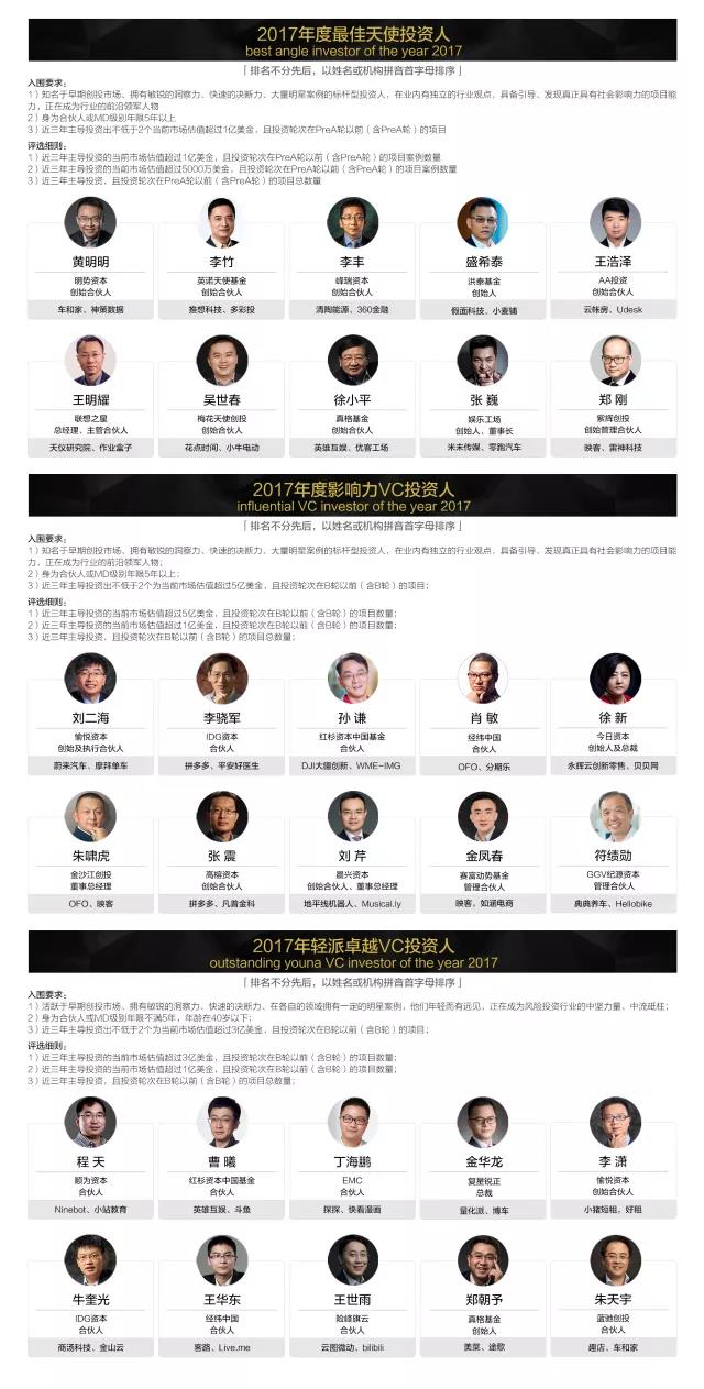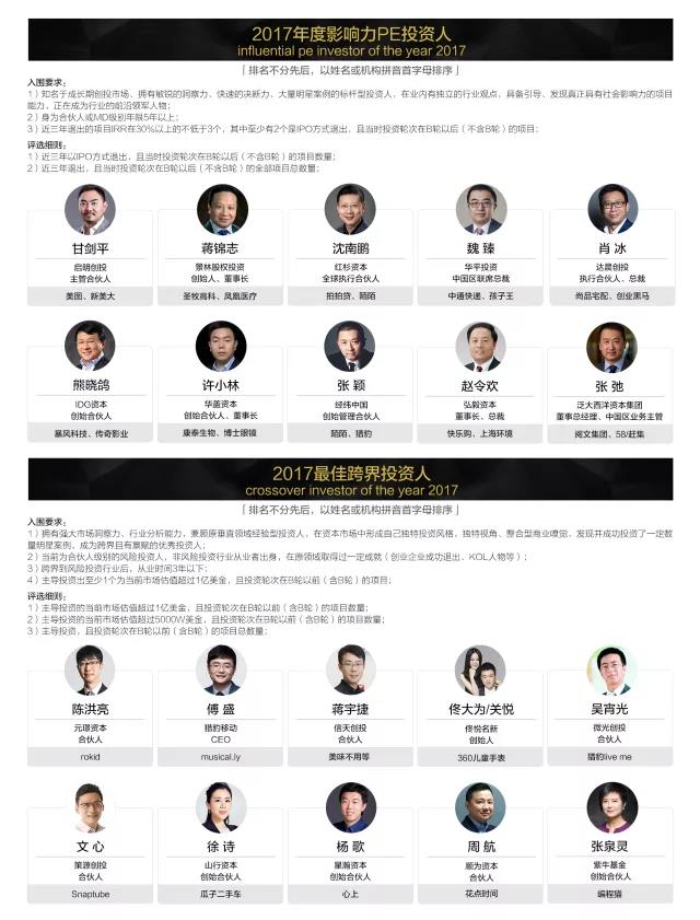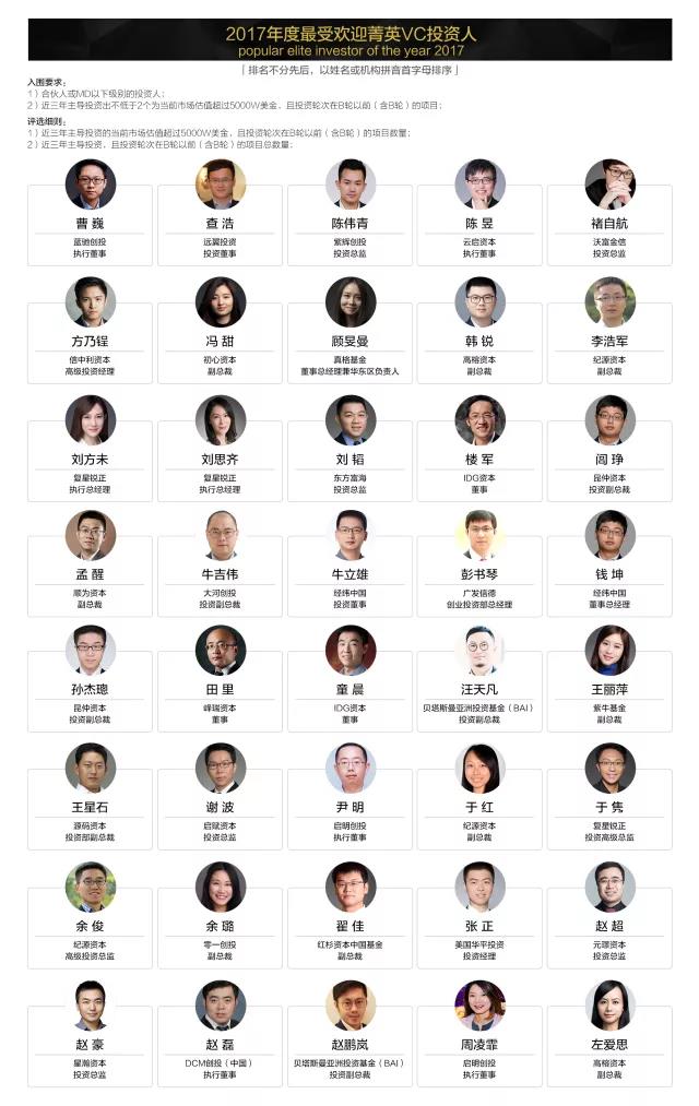 「2017 VC/PE投資人年度影響力榜單」評(píng)選結(jié)果如下:(排名不分先后,以姓名或機(jī)構(gòu)拼音首字母排序)