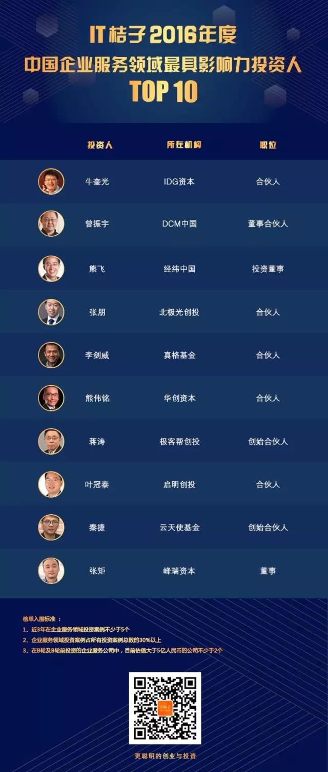 IT桔子2016年企業(yè)服務領域最具影響力投資人TOP 10上榜條件: