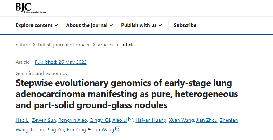 近日,王俊院士團(tuán)隊(duì)與啟明創(chuàng)投投資企業(yè)和瑞基因在亞實(shí)性結(jié)節(jié)型早期肺腺癌的基因組學(xué)研究的合作成果在國(guó)際期刊Lung Cancer和British Journal of Cancer發(fā)表。