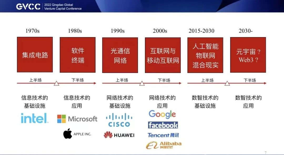 進(jìn)入到90年代,新的科技趨勢是網(wǎng)絡(luò)技術(shù)。在90年代,網(wǎng)絡(luò)技術(shù)的上半場,我們看到新一代光通信基礎(chǔ)設(shè)施的搭建,這時一些網(wǎng)絡(luò)的底層技術(shù)的偉大公司誕生,像思科和華為。到2000年以后,網(wǎng)絡(luò)技術(shù)走到它的下半場,新的應(yīng)用琳瑯滿目涌現(xiàn),隨之誕生了許多偉大的互聯(lián)網(wǎng)應(yīng)用企業(yè),美國有谷歌、臉書等,中國有騰訊、阿里巴巴、百度等。