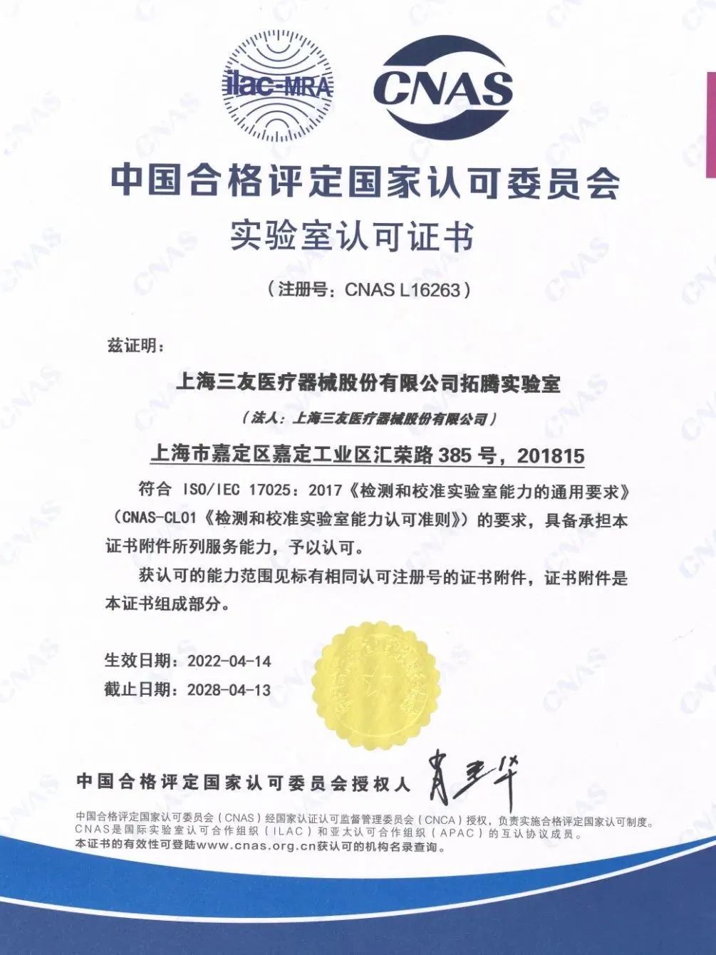 三友醫(yī)療拓騰實驗室獲得CNAS認可