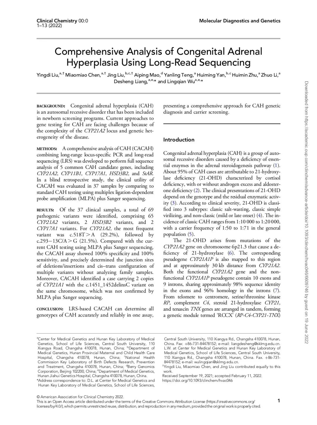 近日,由啟明創(chuàng)投投資企業(yè)貝瑞基因(000710.SZ)提供技術(shù)支持的三代CAH(先天性腎上腺皮質(zhì)增生癥)臨床回顧性研究成果在檢驗醫(yī)學(xué)領(lǐng)域權(quán)威國際學(xué)術(shù)期刊Clinical Chemistry上發(fā)表,這是運用分子診斷技術(shù)探索CAH分子機制的一次創(chuàng)新。