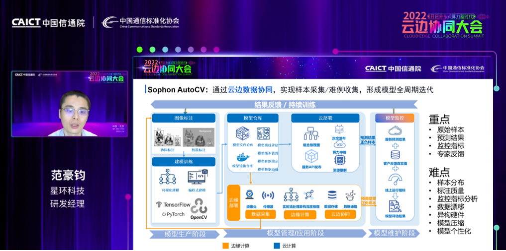 近日,中國信息通信研究院聯(lián)合中國通信標(biāo)準(zhǔn)化協(xié)會在線上召開了“2022云邊協(xié)同大會”。啟明創(chuàng)投投資企業(yè)星環(huán)科技受邀出席智能無限分論壇,研發(fā)經(jīng)理范豪鈞基于云邊協(xié)同的CV模型落地實踐進行了星環(huán)科技Sophon AutoCV邊緣計算架構(gòu)分享。