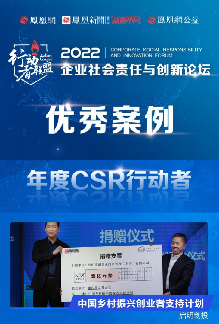 由啟明創(chuàng)投和中國鄉(xiāng)村發(fā)展基金會(原中國扶貧基金會)聯(lián)合發(fā)起的“中國鄉(xiāng)村振興創(chuàng)業(yè)者支持計劃”獲選鳳凰網2022年企業(yè)社會責任與創(chuàng)新案例·年度CSR行動者。