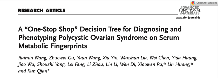 近日,上海交通大學錢昆教授研究團隊聯(lián)合啟明創(chuàng)投投資企業(yè)豪思生物在JCR Q1區(qū)國際材料領域頂級期刊Advanced Functional Materials上發(fā)表題為“A ‘one-stop shop’ decision tree for diagnosing and phenotyping polycystic ovarian syndrome on serum metabolic fingerprints”的研究論文。論文介紹了一種基于血清代謝指紋圖譜(Serum metabolic fingerprints, SMF)的“一站式”決策樹系統(tǒng)。