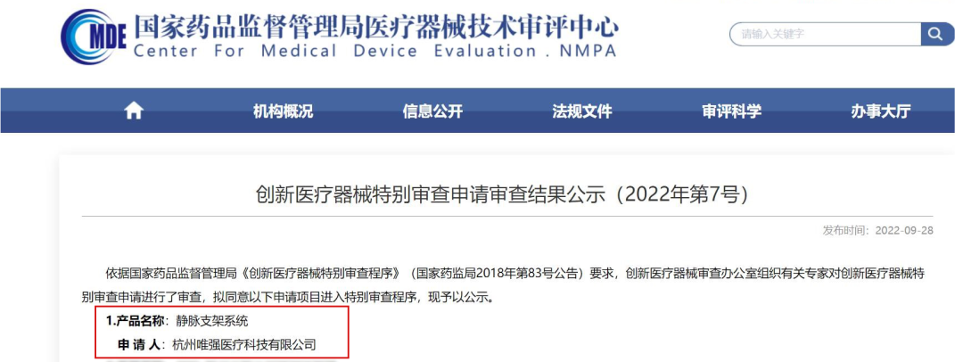 日前,醫(yī)療器械技術(shù)審評(píng)中心官網(wǎng)發(fā)布的創(chuàng)新醫(yī)療器械審查公示期結(jié)束,啟明創(chuàng)投投資企業(yè)唯強(qiáng)醫(yī)療旗下產(chǎn)品Grency?靜脈支架系統(tǒng)進(jìn)入創(chuàng)新特別審查程序。這是繼WeFlow-Arch?模塊內(nèi)嵌主動(dòng)脈弓覆膜支架系統(tǒng)、Fabulous?胸主動(dòng)脈支架系統(tǒng)后,唯強(qiáng)醫(yī)療第三個(gè)進(jìn)入特別審批程序“綠色通道”的創(chuàng)新產(chǎn)品。