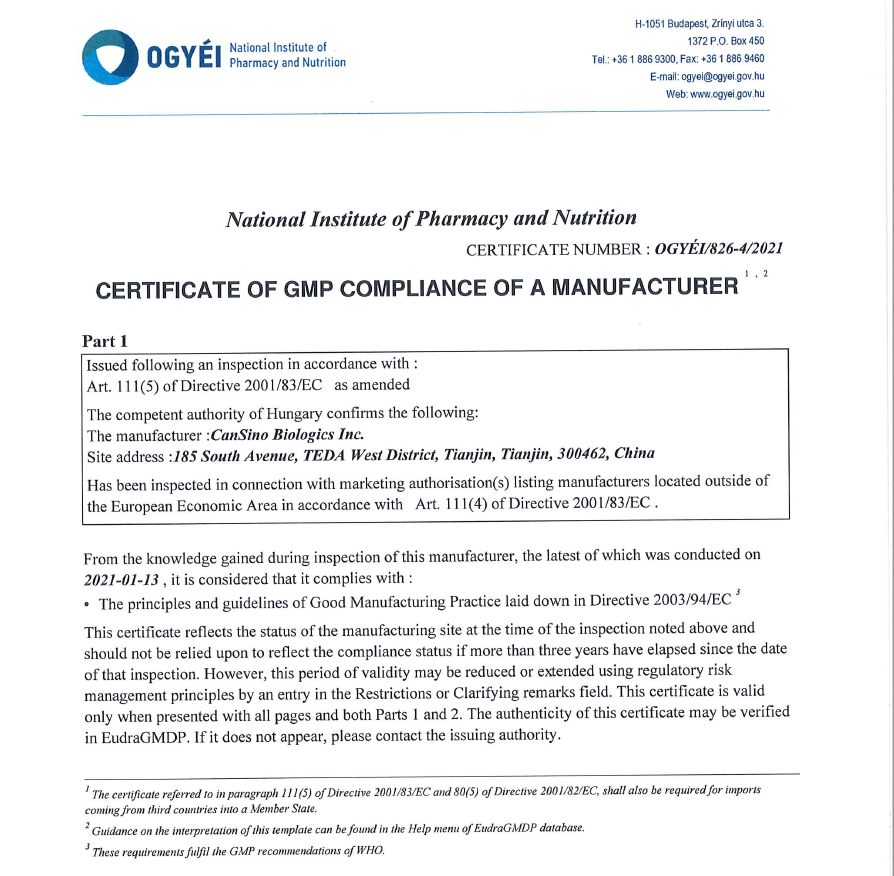 Tianjin, May 21, 2021 - CanSino Biologics Inc. (“CanSinoBIO”) (SHSE: 688185, HKEX: 06185) today announced that its Recombinant Novel Coronavirus Vaccine, (Adenovirus Type 5 Vector) (“Ad5-nCoV”, trade name: Convidecia), has been issued a Good Manufacturing Practice (GMP) certificate by the Hungarian National Institute of Pharmacy and Nutrition (OGYéI).
