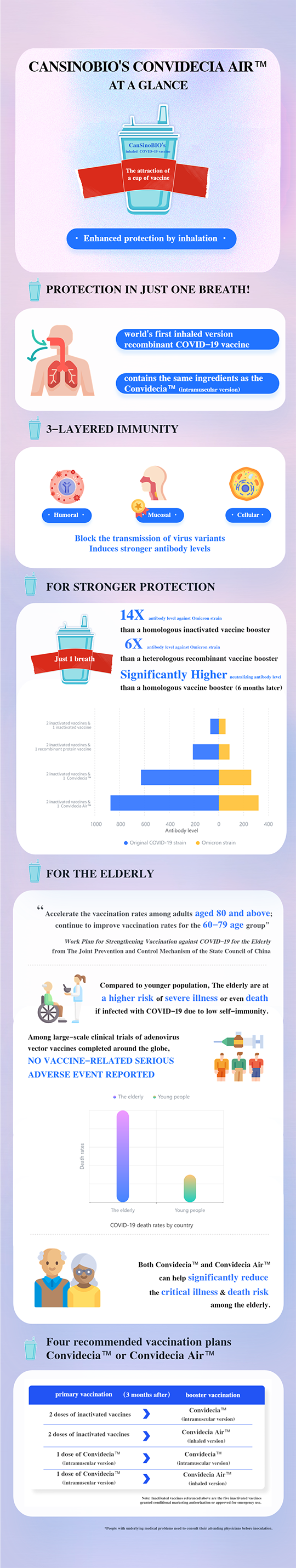 The work plan recommended six vaccination combinations, four of which included CanSinoBIO's intramuscular and inhaled vaccines. Among them, the world's first inhaled COVID-19 vaccine - Recombinant COVID-19 Vaccine (Adenovirus Type 5 Vector) for Inhalation (trade name: Convidecia Air?) independently developed by CanSinoBIO, is currently available for booster immunization of the elderly.