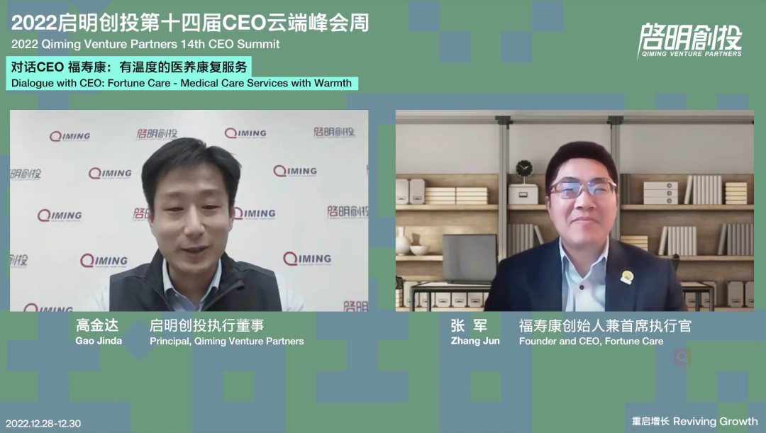 China's aging population is growing, and related social issues are becoming more prominent. As a leader in home care service, Fortune Care's Founder and CEO Zhang Jun discussed with Qiming's Principal Gao Jinda about how he decided to start business in this field, and how to contribute to industry development through talent supply and ecosystem construction. When it comes to digital innovation, Zhang Jun pointed out that digitalization is Fortune Care's exploration of future possibilities where digitalizing the needs of customers and the capabilities of employees generates better matching efficiency for customers.