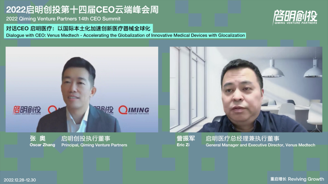 The next session took place between Qiming's Principal Oscar Zhang and Eric Zi, General Manager and Executive Director of Venus Medtech (SEHK: 2500). Eric Zi shared the accomplishments in the past year, unique advantages over international giants, and future market plan. He said that the first step of Venus Medtech's development is to firmly establish structural heart disease treatment as the cornerstone, then expand business through the cooperation with investment firms or technology incubated by Dinova Medtech, set up an international platform, accelerate the globalization of innovative medical devices, and hopefully build Venus Medtech's position as China's Medtronic in the future.
