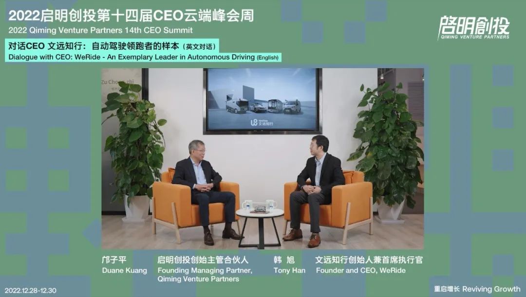 Qiming's Founding Managing Partner, Duane Kuang, and WeRide's Founder and CEO Tony Han had an in-depth conversation sharing the progress of WeRide's five major product lines, team building and corporate culture, as well as their outlook on an autonomous driving future. Speaking of his vision for WeRide, Tony Han said that he hopes WeRide will not only develop cool autonomous driving technologies, but also truly mature products that will be valuable in the lives of ordinary people and help solve the problems of human society.