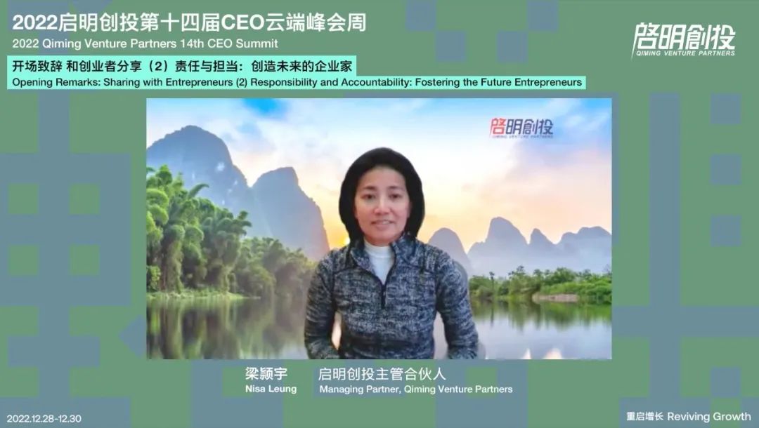 During the second "Sharing with Entrepreneurs" session, Qiming's Managing Partner Nisa Leung opened Day 2 with "Responsibility and Accountability: Fostering the Future Entrepreneurs" speech. She noted that Qiming has always been a friend of entrepreneurs, focusing on early-stage investment, core technology, and true innovation, and Qiming hopes to be not only the first investor but also the most important investor for companies.
